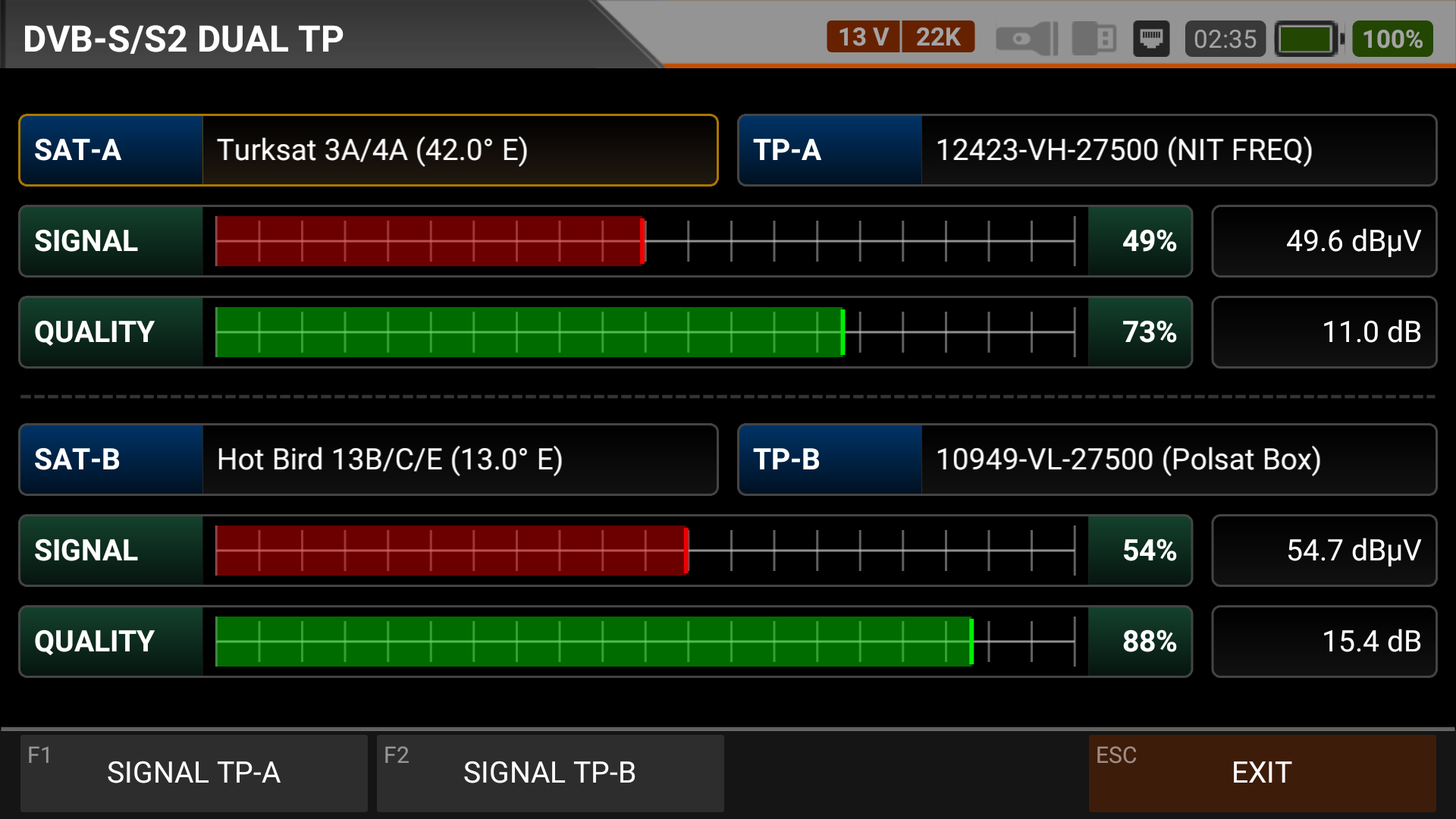Measuring 2 Satellite Signals on a Single Screen for Dual Feed Lnbler