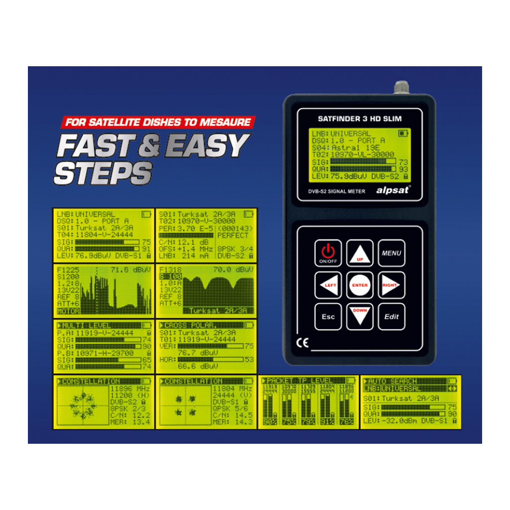 SATFINDER 3 HD SLIM is an affordable DVB-S / DVB-S2 Satellite Signal Meter equipment with Spectrum and Constellation for professional dish antenna installers.