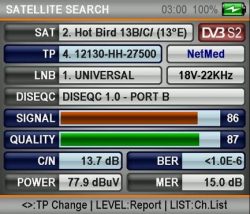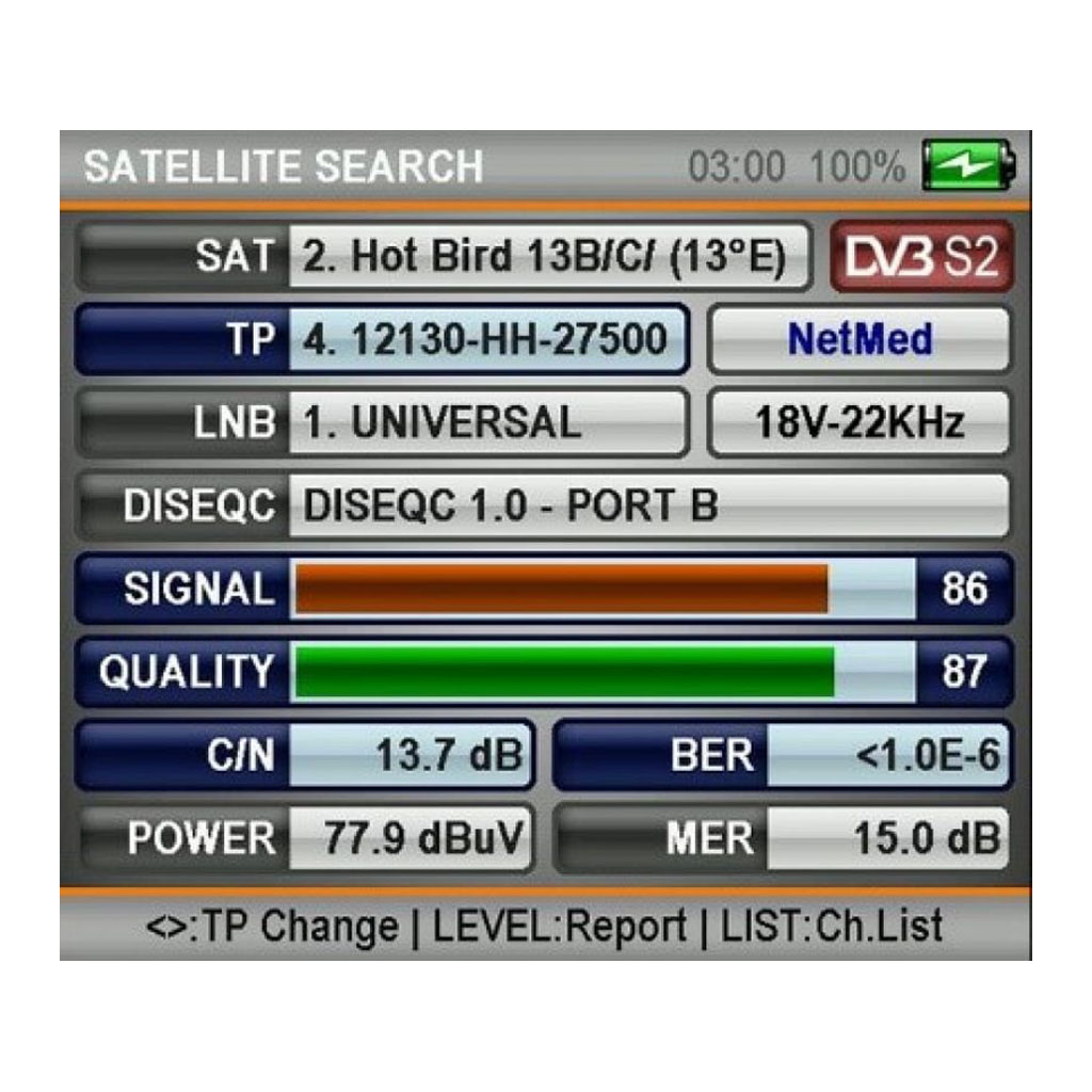 The device has 34 different LNB type memory. It also has user-customizable LNB types. 22Khz Tone – 13/18V selectable. Supports Diseq-C 1.0-1.1-1.2 and Multiswitch central systems. It may perform USALS motor system installations and may measure UNICABLE I&II types on a single cable. Changable F connector and The Lnb supply has protection against short circuits, has screen warnings.