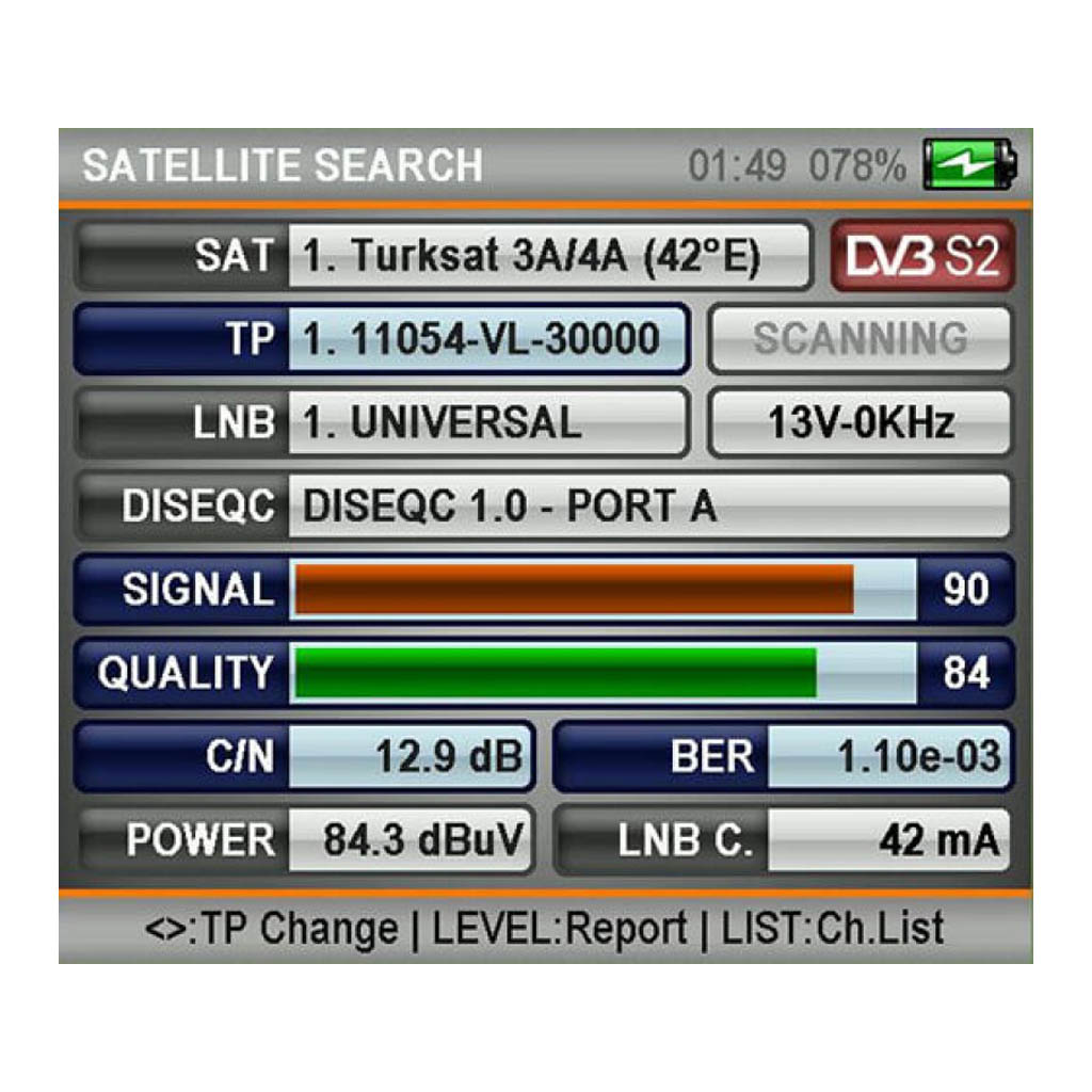 The device has 32 different LNB type memory. It also has user-customizable LNB types. 22Khz Tone – 13/18V selectable. Supports Diseq-C 1.0-1.1-1.2-2.0 and Multiswitch central systems. It may perform USALS motor system installations and may measure UNICABLE I&II (SCR,dCSS) EN50494/EN50607 JESS systes on a single cable. The Lnb supply has protection against short circuits, and has screen warnings. You can also use SATFINDER 5 PRO-AHD as an AHD-TVI-CVI-ANALOG cctv camera test monitor.