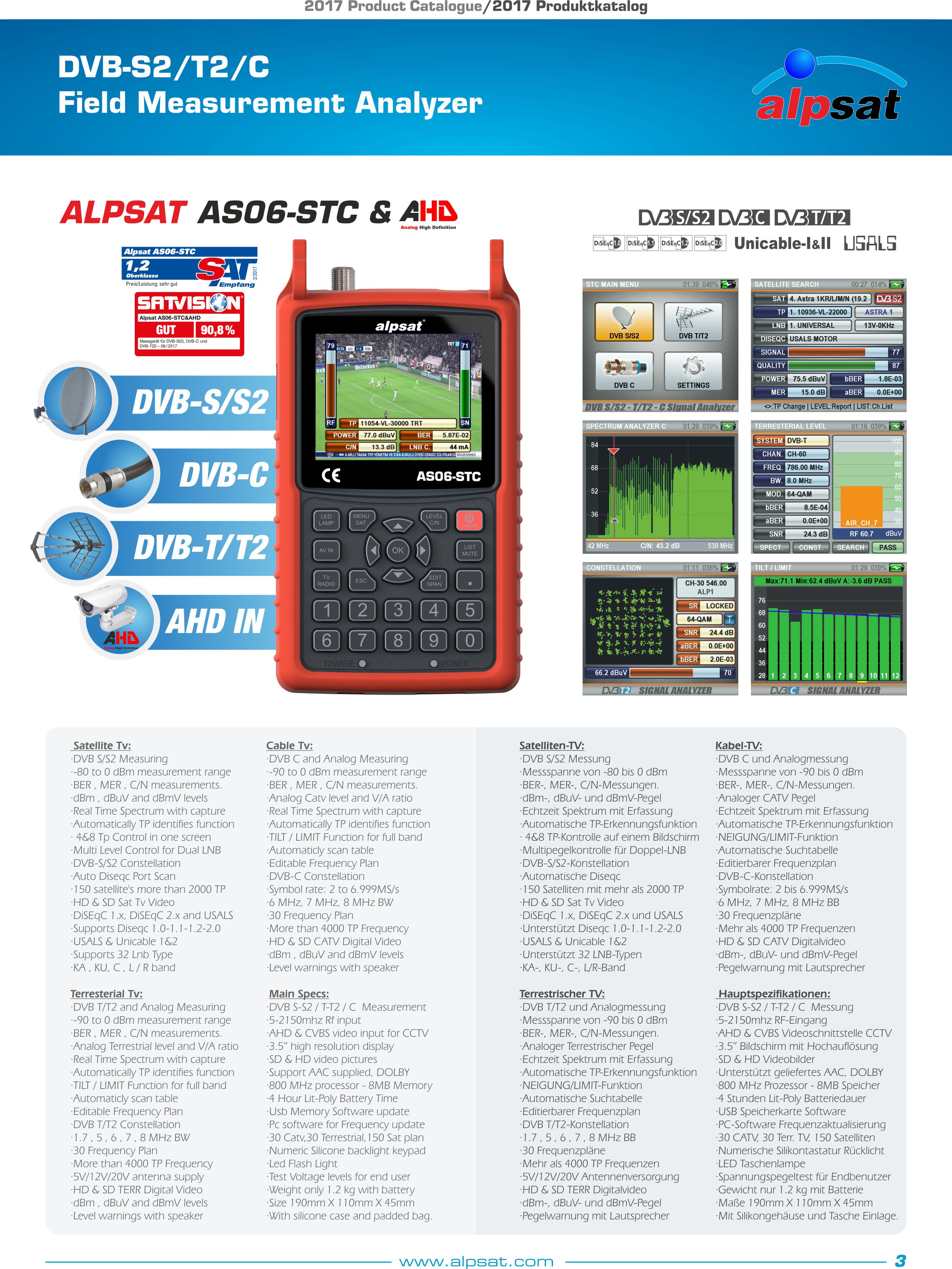 - DVB-T/T2 and Analog Terresterial Measuring : 45 – 1002 MHz